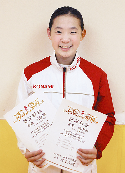 2月21日・22日に東京辰巳国際水泳場で行われた「KONAMI OPEN 2015 水泳競技大会」に、コナミスポーツクラブ天王町に通う泉原凪沙さん(小6・旭区在住)が出場。女子背泳ぎで50m29秒17、100mで1分2秒54をマークし、それぞれ日本学童新記録を更新した。