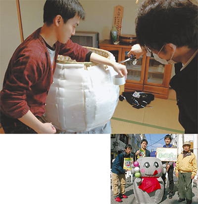 学生はキャラクターの存在をより多くの地域住民に知ってもらおうと着ぐるみ製作を思案。商店街関係者を通じ出会い協力を依頼した、地元に暮らす元竹細工職人・野路昭五さん(85)が籠編みという手法で仕上げた竹製の骨組みに学生がスポンジや布を貼り重ね、1カ月の製作期間を経て体高1mほどの着ぐるみを完成させた。