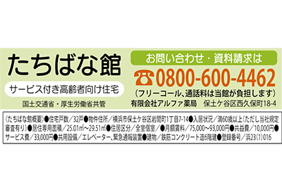 「自宅」「老人ホーム」という選択に限られてきたシニアの生活に新たな形が誕生し話題を集めている。60歳以上であれば単身(1人)でも安心して入居できる天王町の賃貸マンション「サービス付き高齢者向け住宅『たちばな館』」を取材した。