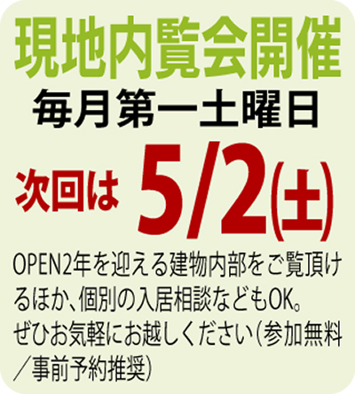毎月第1土曜日には内覧会を開催(次回は5月2日)。「建物の見学はもちろん、入居に関する個別相談なども大歓迎です」と担当者は呼び掛けている。