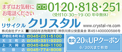 横浜市内に4店舗を構えるリサイクルショップ「クリスタル」は、電話1本で女性スタッフが無料出張買取に来てくれるため「安心で便利」と、20年の信頼と実績をもつ。しかも洋服からバッグに靴、着物に子供用品、生活雑貨まで買取品目が多く、一度に処分したい人にも嬉しいところ。