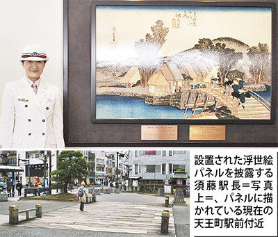 JR保土ヶ谷駅(須藤理恵駅長)=人物風土記で紹介=の改札前に3月4日、歌川広重が各地を描いた浮世絵「東海道五拾三次」のひとつ「保土ヶ谷 新町橋」のパネルが設置された。沿線の歴史や文化に触れてもらおうと、昨夏から旧東海道沿いの8駅(小田原・川崎・藤沢・戸塚・平塚・大磯・東神奈川・保土ヶ谷)にそれぞれの宿場にちなんだ作品のパネルが設置されている。