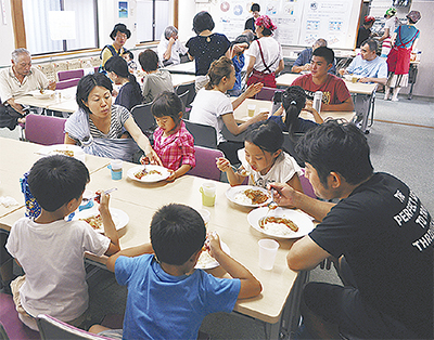 近隣の子どもからお年寄りまで集まって夕食を囲む、岩井町原連合町内会主催の「みんなの食堂」が好評だ。4月から月1回のペースでスタートし、4回目となった7月19日には70人が参加した。