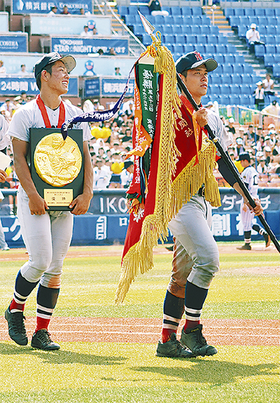 「全員で戦い、みんなでつかんだ優勝。相模に勝って甲子園に行きたい思いは強かった」と喜びを語る福永主将。大会前、平田徹監督が「発展途上」と話したチームは、勝ち進む中で成長した。監督から自立や主体性が求められる中、選手たちは福永主将を中心にミーティングを重ね一体感を強くしてきた。平田監督は「大会を通してチームワークが優れていた。全員が一つになって戦っていた」と評価した。昨年もプレーした甲子園を前に福永主将は「目標は全国制覇だが、まずは昨年の2回戦を突破したい。今年のチームは底力があると思う。チャレンジャー精神で戦いたい」と一戦必勝を期する。