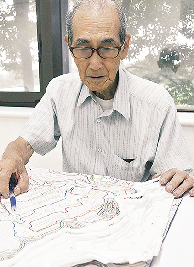 歴史や地理を好み、訪れた先の景色や行くことができない場所を「鳥のように上から見てみたい」と考えていたという村田さんは、定年後の趣味として薄いシート状の材料を等高線どおりに切り、重ねていくことで勾配や地形の特徴が実感できる立体地図の製作を独学で始めた。1933(昭和8)年生まれの酉年。「酉年だからですかね、鳥の目線で土地を見たいんです」という。