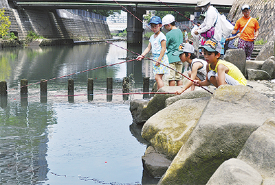 30人ほどの小学生が参加したこの日の催しでは、まず川の生き物の採取からスタート。子どもたちはエビを餌にマハゼやヌマチチブなどを釣り上げ観察した。講師は生息する生物について説明するとともに、同河川の流域環境などについても解説していた。