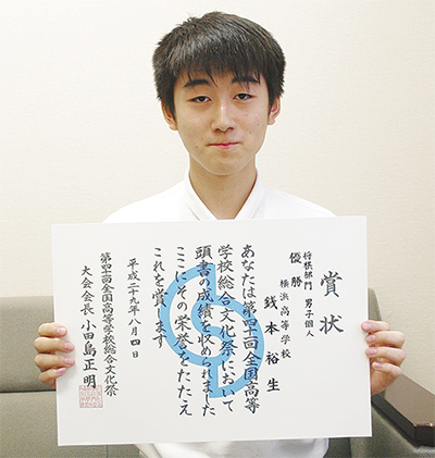 川辺町在住の銭本裕生(横浜高校3年)さんが、夏休み期間中に行われた「第30回全国高校将棋竜王戦」で初優勝した。2月の高校文化連盟将棋新人大会と8月初旬の全国高校選手権と合わせ、高校の全国大会3冠という快挙を達成した。