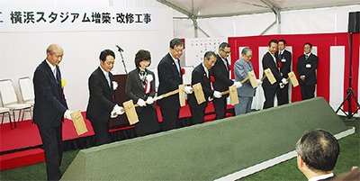 今年開業40年を迎える横浜スタジアムでこのほど、同球場の増築・改修工事の起工式が行われ、横浜DeNAベイスターズの南場智子オーナーや岡村信悟社長のほか、工事や行政の関係者、市会・県議会の議員らが集まった。