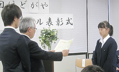 犯罪被害防止などを具体的に呼びかけることを目的に区が募集していた「ほどがや防犯川柳コンクール」の表彰式が3月5日、保土ケ谷区役所で開かれ、569作品の中から最優秀賞作品に選ばれた保土ケ谷中学校1年生・小野寺絢梨さんら入賞者に菅井忠彦区長らから表彰状が贈られた。