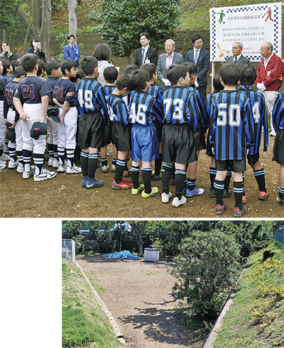 少年野球チームやサッカーチームの子どもたちも参加し7日に行われた式典で、区担当者は「面積的には狭くなるが、地域の要望に応えることができ嬉しい」と話し、広場を管理する運営委員会の中尾親志代表は「多くの協力があって実現しての再開放。大切に使っていきたい」と話した。