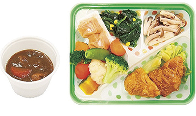 ハマ弁はごはん、おかず、汁物、牛乳のフルセットで340円。カレーは汁物のメニューとして提供され、汁物単品(30円)の注文もできる。
