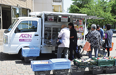 区内の丘陵部で買い物に不便を感じている高齢者などを支援しようと、イオン天王町店が昨夏から食料品や日用品を配送拠点に届ける移動販売を行っている。販売開始以降、1日平均約70人が買い物に来るなど地元住民からは歓迎の声が上がっているほか、人が集まることで新たなコミュニティーの場を形成するなどの役割を果たしている。