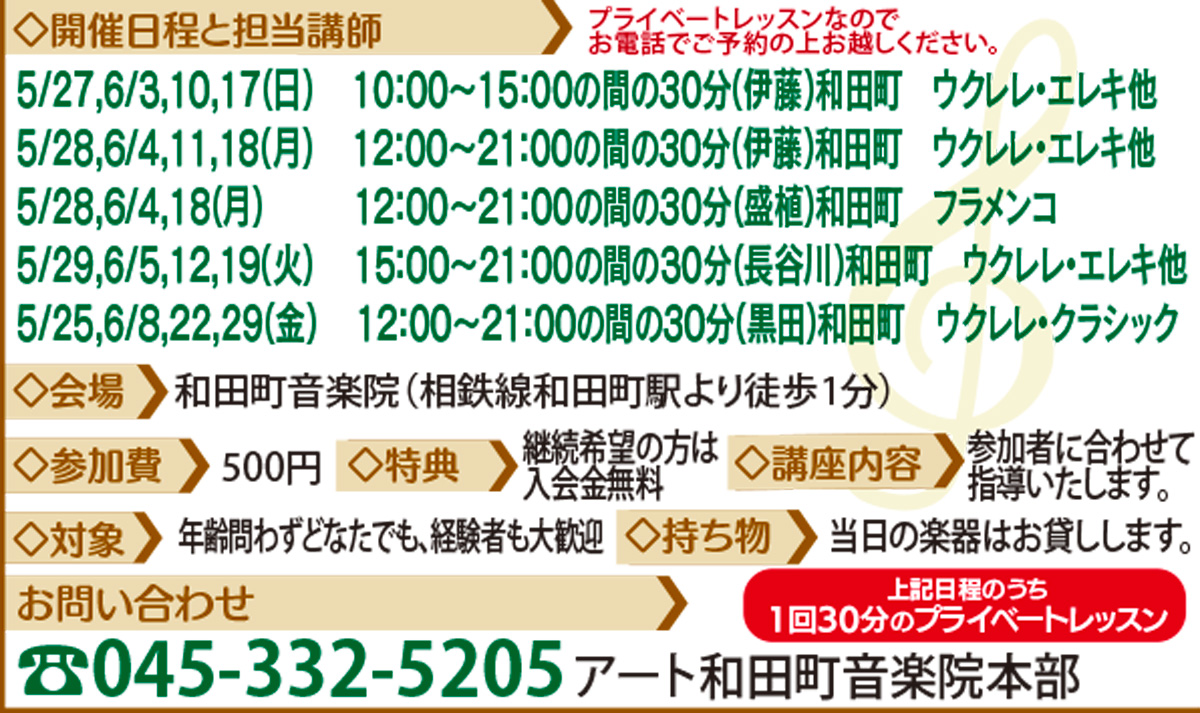 プライベートレッスンでギターやウクレレを学べる教室を和田町音楽院が主に初心者を対象に開講する。