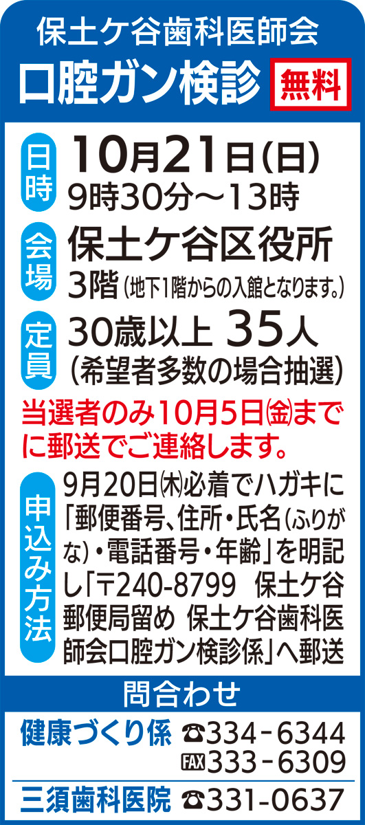 ※保土ケ谷歯科医師会では、年に一度、口腔ガン検診を無料で行っております。