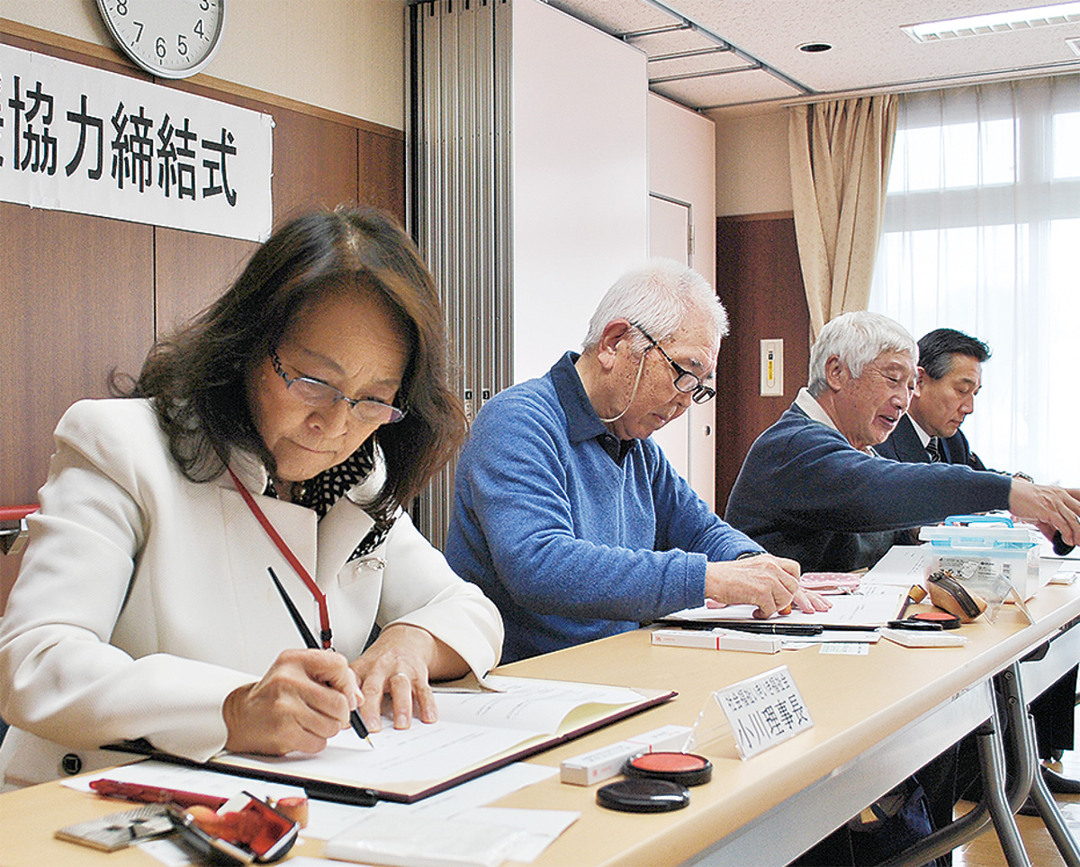 峰沢町にある三ツ沢住宅自治会(鈴木一三会長)と同住宅管理組合(加藤武義理事長)、特別養護老人ホームラポール三ツ沢を運営する社会福祉法人いきいき福祉会(小川泰子理事長)が2月14日、災害発生時の消防応援について相互に協力し合う協定を結んだ。