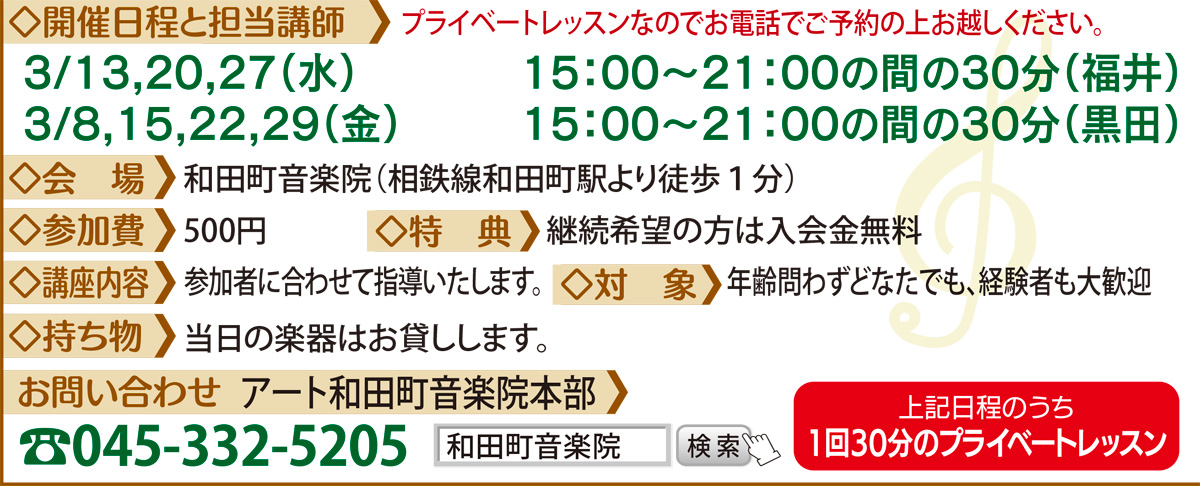 プライベートレッスンでクラシックギターが学べる教室を和田町音楽院がおもに初心者を対象に開催している。