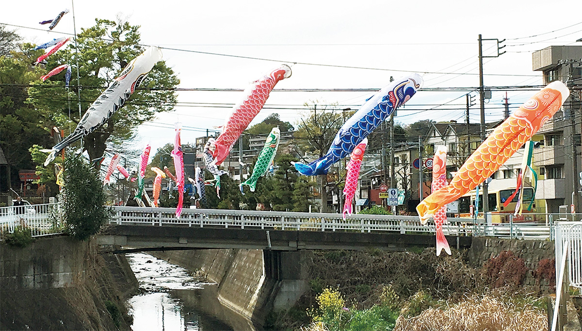 今井川の瀬戸ヶ谷中橋付近に優雅に風になびく鯉のぼりが揚げられている。