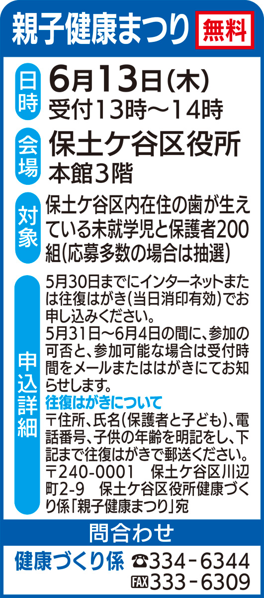 保土ケ谷区役所では毎年 歯と口の健康週間行事として歯科医師と歯科衛生士も参加して「親子健康まつり」を開催しています。歯や食育について知ることができ、むし歯予防に有効なフッ化物塗布をお子さまに行っています(無料)。保護者向けの歯科健診や、乳がん検診についての情報提供などもあります。スタンプラリー方式で、全てまわった方にはお土産を差し上げます。