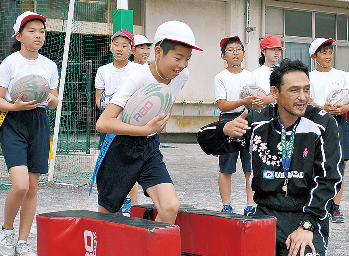 川合さんは児童を前にトップ選手の多くが幼少期から楕円球に触れて育っている中、少年時代にはピアノを学んでいたという自身のエピソードを披露。「興味のある事にチャレンジしてほしい。失敗を気にせず、チャレンジを楽しんで」と呼びかけた。