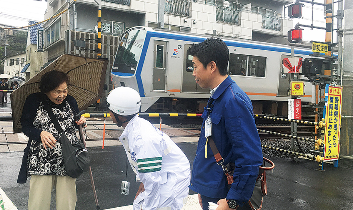 この日は市職員や警察署員、相鉄職員が踏切の通行者に横断ルールや踏切内でトラブルが発生した場合の非常ボタンの利用などを周知するチラシを配布した。
