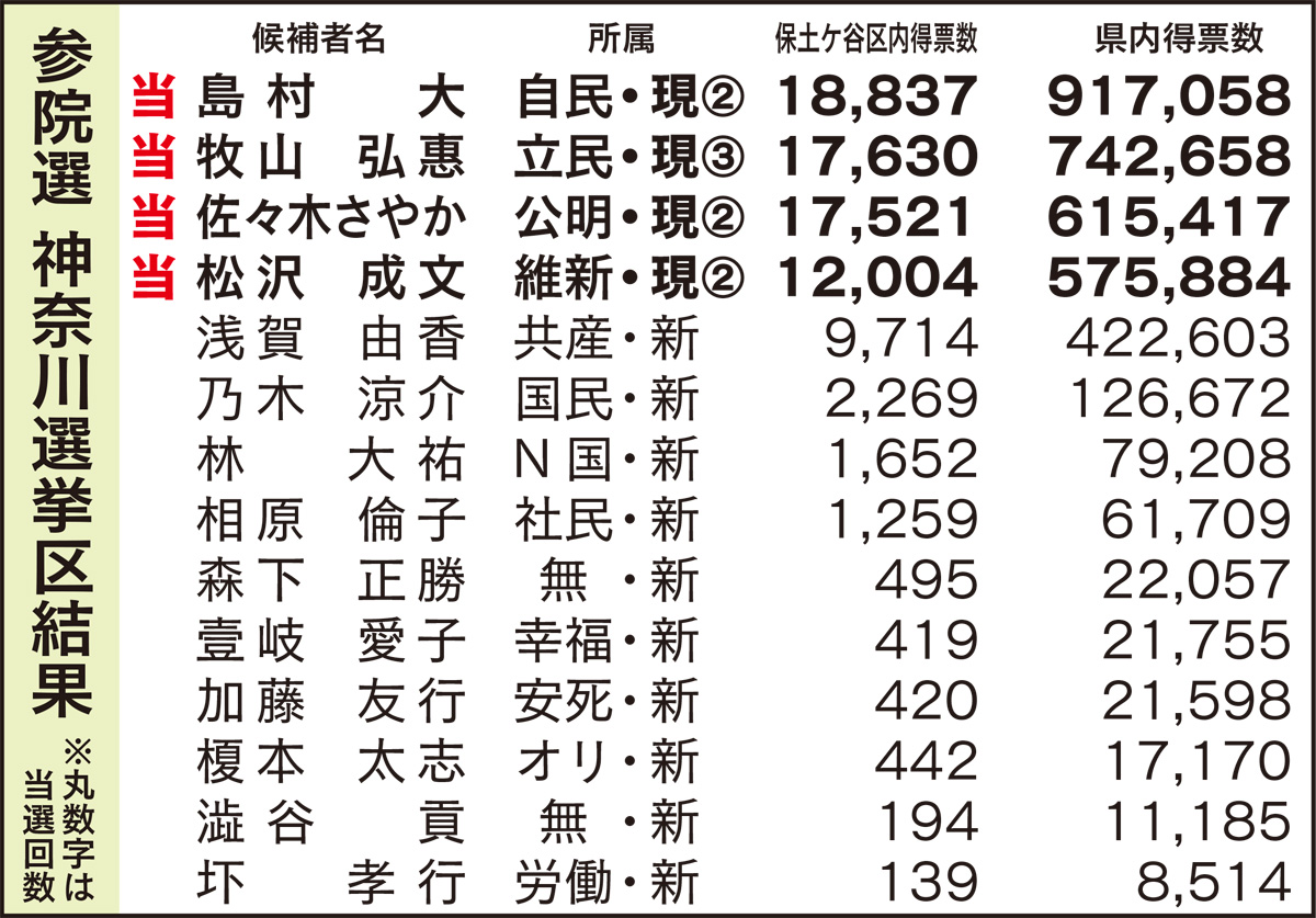 参議院議員選挙の投開票が7月21日に行われた。4議席を14人が争った神奈川選挙区は、自民党の島村大氏(58)が約91万7千票を獲得し、トップ当選。以下、立憲民主党の牧山弘惠氏(54)、公明党の佐々木さやか氏(38)、日本維新の会の松沢成文氏(61)が当選し、現職4人が議席を守った。保土ケ谷区でも島村氏がトップで、約1万9千票を獲得した。
