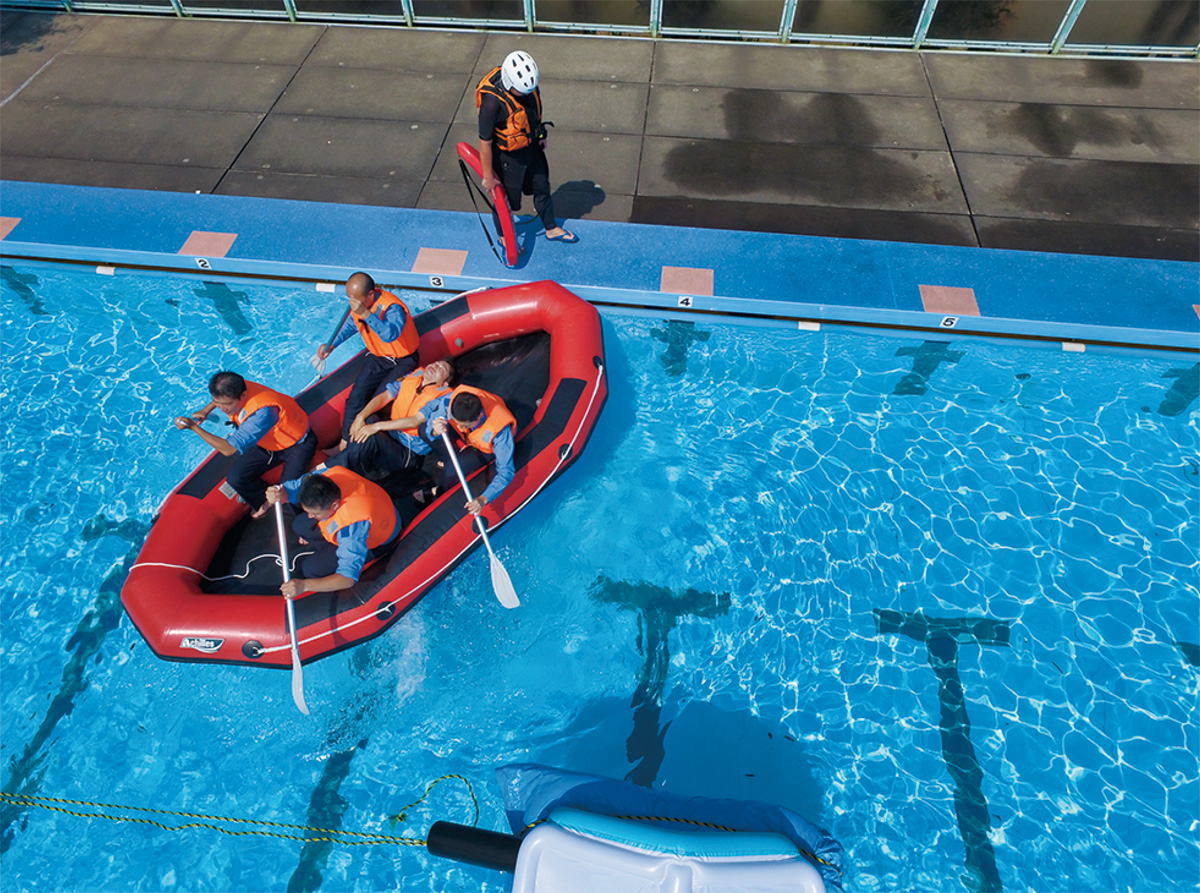 訓練では県警察本部危機管理対策課即応対策チームが指導。「できるだけ入水せずに救助することが大切だ」と署員の前で講義を行った。その後、ロープを使った救助法やボートの漕艇法などを学び、今年の3月にドローンを使い大規模災害やテロ対策に伴う活動支援に関する協定を締結した(株)JINSOKUTSU(南博司代表取締役社長)によるドローンを活用した総合訓練も今回初めて行われた。同チームの担当者は「川や海ではお酒を飲んだ状態で水に入らず、遊ぶ場所の流れや地形をよく知ることが大切。クーラーボックスなどといった水に浮く物を近くに置いていざというときに備えて」と話した。