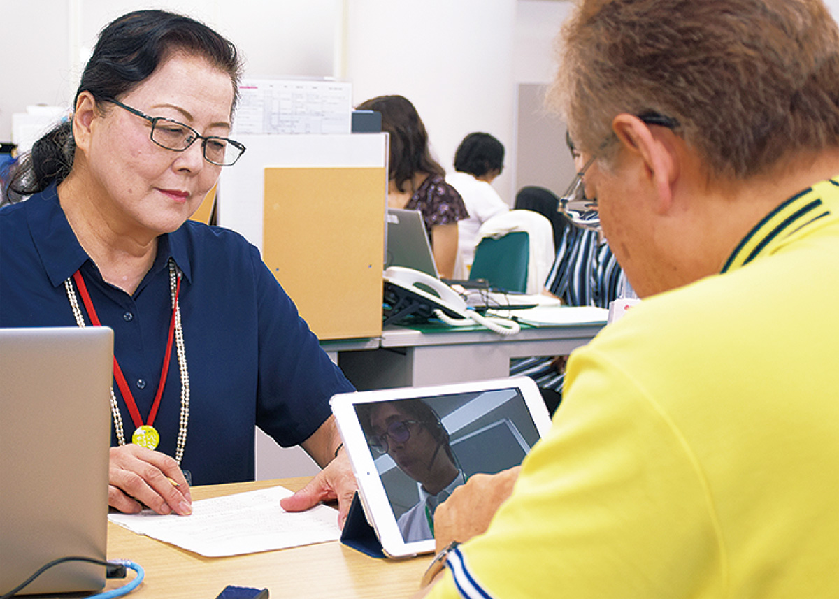対応言語はこれまでの日本語、英語、中国語、スペイン語に加え、介護人材として期待されるベトナム人への対応を見据え、ベトナム語を話すことができる相談員を配置。常駐する相談員も3人から4人とした。さらに、11言語に拡充した多言語対応や専門的相談の場合は電話通訳を使用。同センター利用者はタブレットに映し出された通訳の顔を見ながらの相談が可能。また、市内に10カ所ある国際交流ラウンジに外国人が訪れた場合でも、同センターと端末でつなぐことで電話通訳サービスを無料で受けることができる。同コーナーと国際交流ラウンジへ2018年度に寄せられた相談は2万2千件以上。今後同センターは連携拠点としての役割も担う。