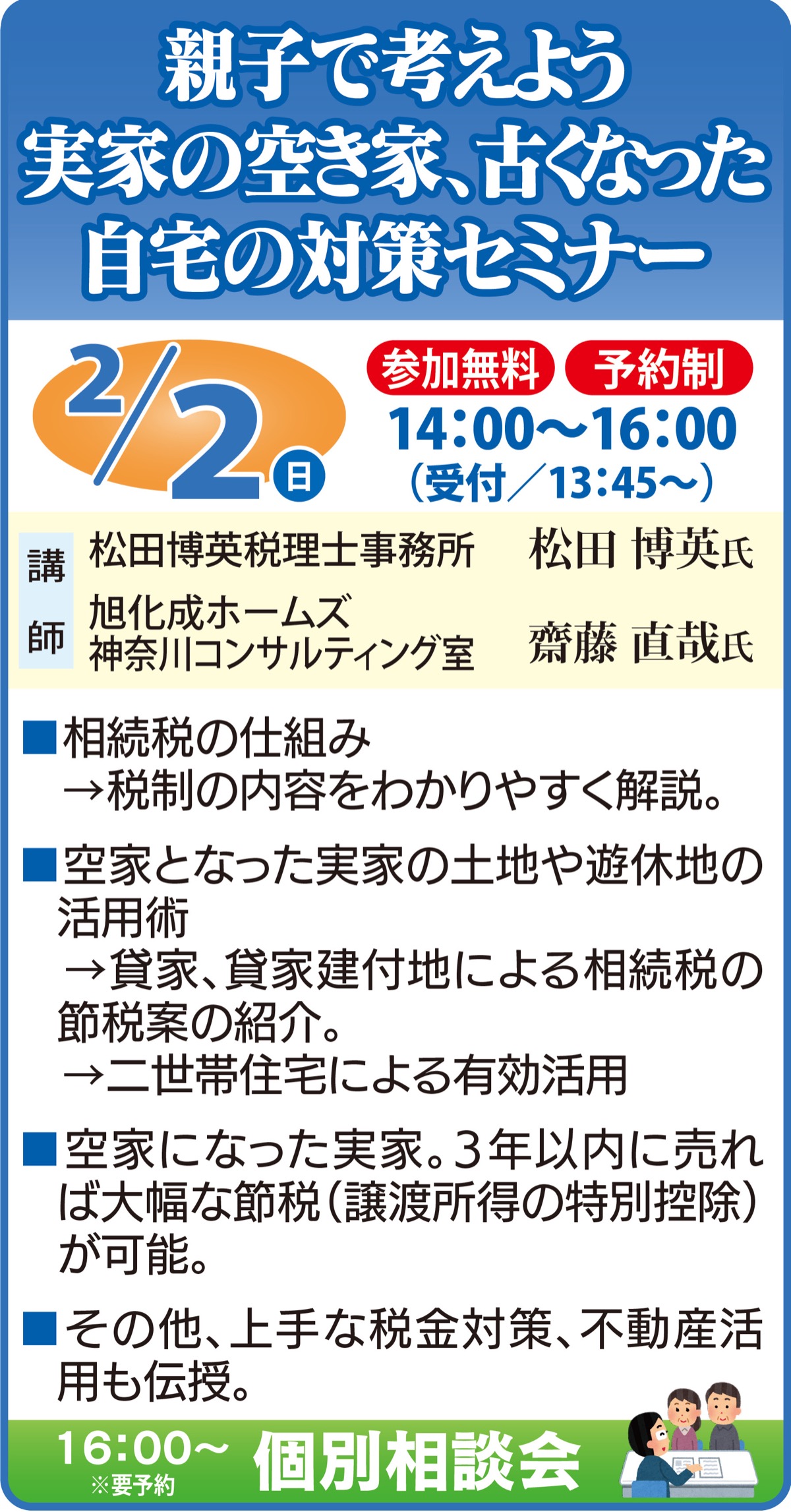 団塊世代の相続が進む中、毎年増加しているのが空き家問題。増税など厳しい状況の中、早めの準備や対策は不可欠となっている。これを受け、旭化成ホームズでは2月2日(日)、午後2時から「実家の空き家や古くなった自宅の対策セミナー」を開催する。参加無料・要予約。当日は知っておきたい相続税の仕組みや改正ポイントを分かりやすく解説。空家にかかる譲渡所得の特別控除や、知らないと課税対象となるケースなど、あまり知られていない二次相続まで見据えた特例のほか、知れば得する税金対策も満載。希望者には個別相談(当日または後日)もできるので、ぜひこの機会に。