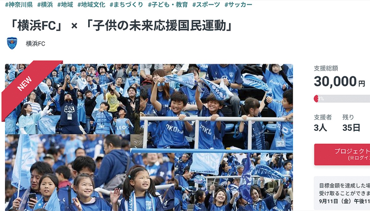 川島町を拠点とするサッカーJ1・横浜FCが、子どもを支援することを目的にネット上で支援者を募るクラウドファンディング(CF)を立ち上げ賛同を呼びかけている。目標金額は100万円で9月11日まで募る支援金額に応じ、限定のオリジナルキャップや選手のサインが入った感謝状などが返礼品として用意されている。