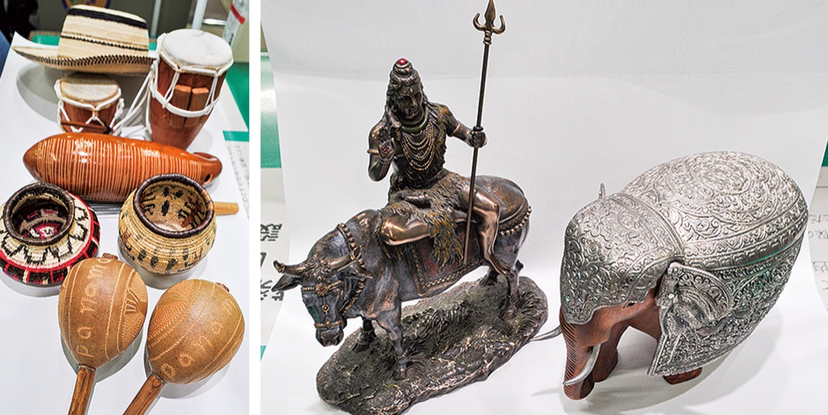 保土ケ谷区役所1階にある区民ギャラリーで11月4日(水)まで、横浜市と姉妹都市提携55周年を迎えたフィリピンのマニラ、インドのムンバイの民芸品などが展示されている。