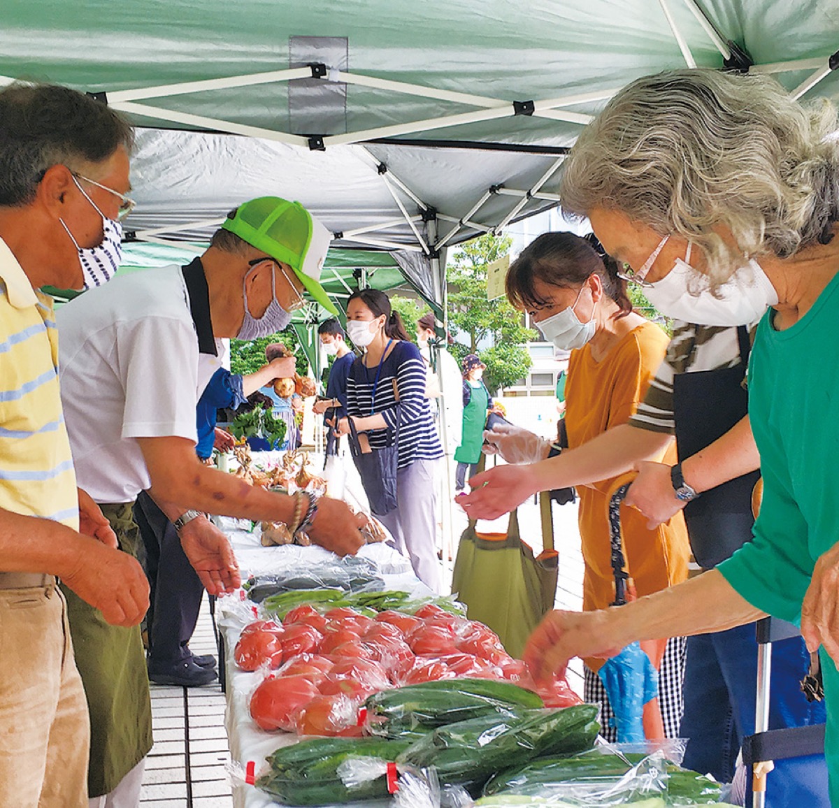 川島町の3軒の農家が育てた新鮮な地場野菜を求め、毎回多くの人で賑わいを見せる人気企画。新型コロナウイルスの感染拡大を受け、一時開催を見送っていたが、ソーシャルディスタンスを確保するため、販売ブースへの立ち入り人数を制限するなど工夫を凝らし6月から再開した。