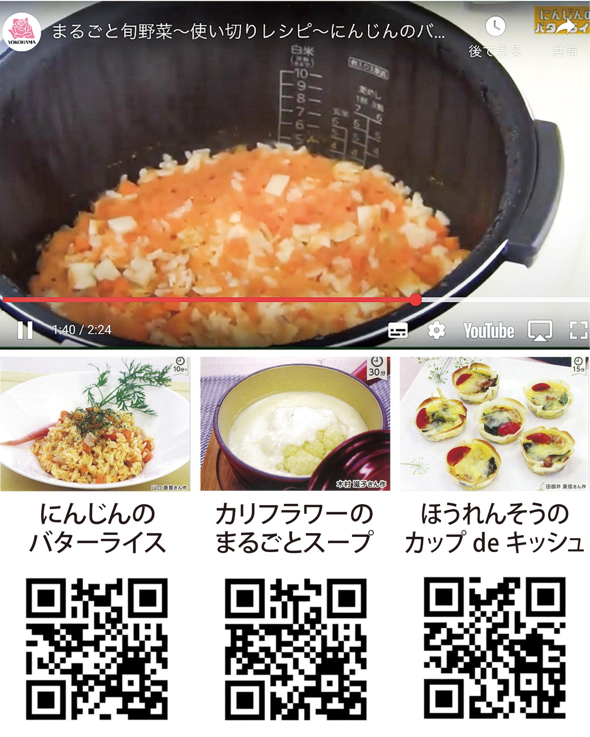 今回はこのレシピ集に掲載されているメニューの中から、人参を使ったバターライス、カリフラワーをまるごと使ったスープ、ほうれんそうのキッシュの3品を配信。調理工程を2分ほどにまとめ、野菜の保存方法や、残ってしまった際のリメイク術も紹介している。
