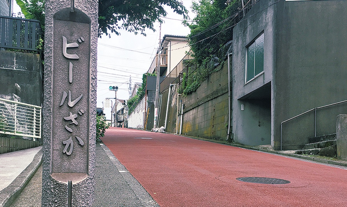 交差点から月見台交差点まで延びる急坂は約400メートル。大日本ビール会社(明治39年頃設立)が、近くに湧出する清水を利用してビールを製造していた。清水へ通ずる坂だったことから、この坂に「ビール坂」という名が付けられたという。歩きで登り切るには相当な覚悟が必要だ。