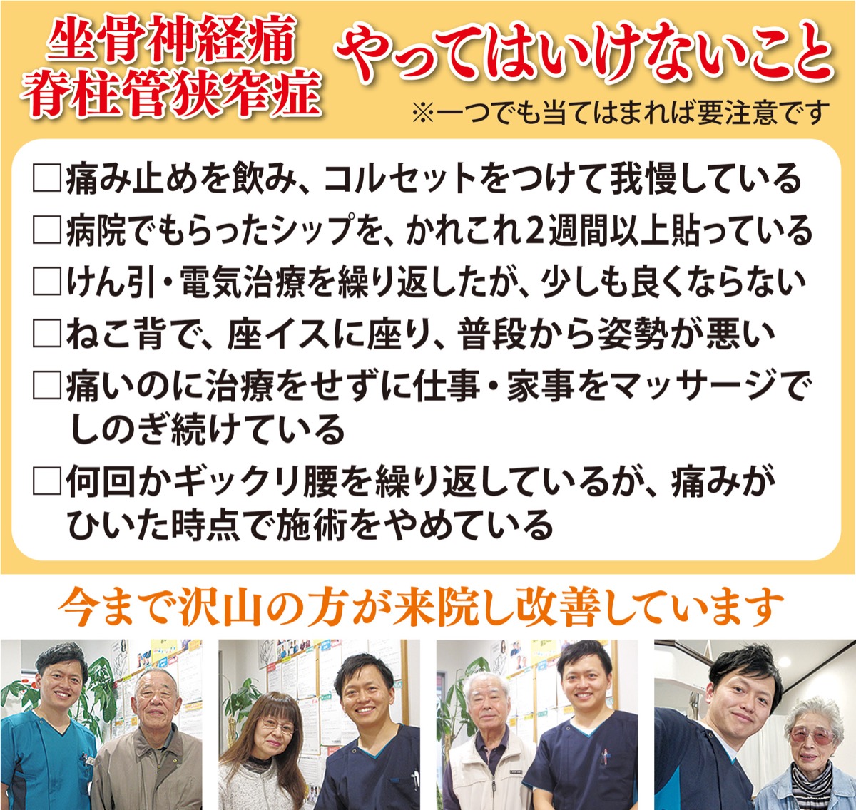 「立ち上がりが辛い」「長く歩いてられない」「最近、さらに痛みや痺れが増してきた」など中高年に多くみられる坐骨神経痛や狭窄症による症状。腰部・臀部から下半身に痛みや痺れが生じ、そのまま放置するとますます悪化する場合も。やす整体院では「病院で手術しかないと言われた」「薬やマッサージでも改善しない」「このままでどうしたらいいのか分からない」と悩む人が多く訪れる。院長は「まずは詳しくお話を聞いた上で施術や日常生活動作の指導をします。歳だからと諦める前にご相談ください」と話す。※要予約制