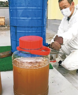 巣箱から取り出された板を遠心分離機にかけ、蛇口のコックを開き蜜が流れ出すと甘い香りが立ち込めた。この日、集まった純度100%の和田産ハチミツは20kg、甘さを表す糖度は62・8でやや低めだが、品質も上々だという。