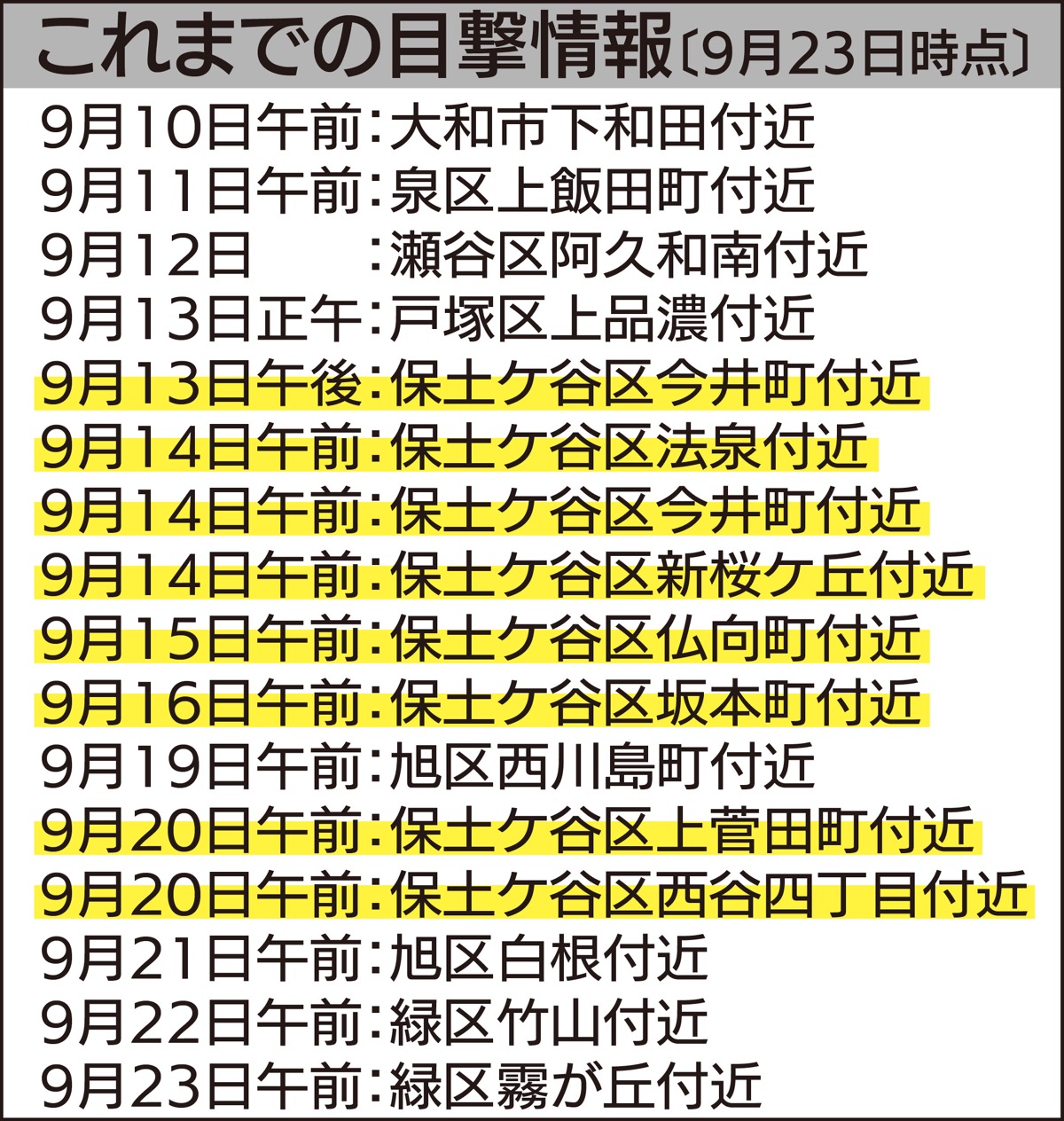 被害報告もなく、現時点では捕獲対応の予定などはない。その上で「えさを与えず、不用意には追いかけないでほしい。近づいて興奮させると危険なので、目を合わせず、背中を見せないようにして、ゆっくりその場を離れてほしい。また家に侵入されないよう、窓を開けっぱなしにしないようにしてほしい」と注意を呼び掛けている。