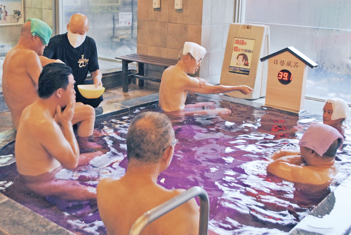 全国の温浴施設が参加する「日本列島しあわせピンクバスプロジェクト」の趣旨に賛同した取り組みで、「ピンクリボンデー」の1日、男湯の日替わり風呂では「乳がんは男性にも起こり得る病気です。セルフチェックをしてみてください」「パートナーに検診の受診を勧めてください」とスタッフが声を掛けながら、ピンク色の湯船に浸かる来場者にピンクリボン型に模ったコラーゲンを手渡していた。