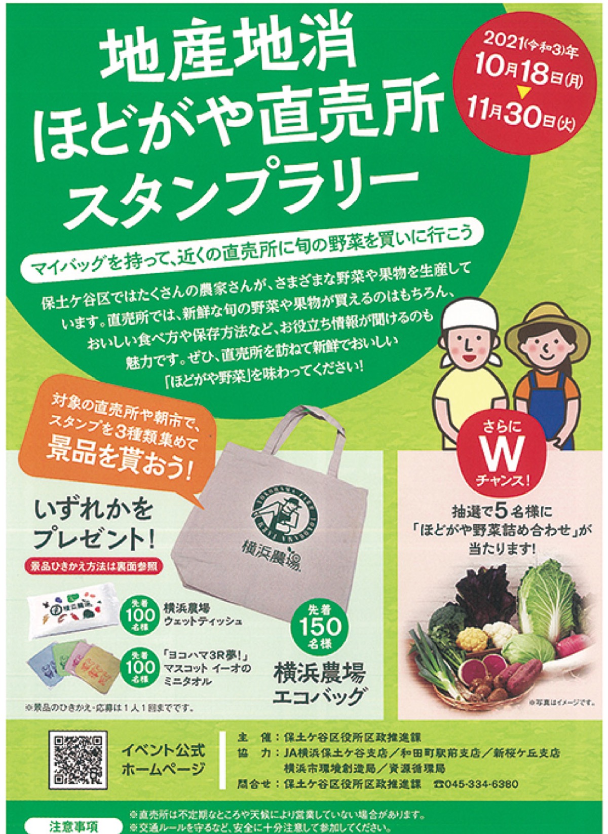 区内産の地場野菜などを販売する直売所や朝市(西谷朝市会・和田駅前直売会・JA横浜新桜ケ丘支店直売所・斎藤幸男野菜直売所・FRESCO・渡邉農園・なないろ畑・グリーンスポットさかうえ・三村薫農園・石井農園青空やさい・やさい直売所・まちなか農家さんのほどがや朝市)を巡るスタンプラリーイベントが11月30日(火)まで催されている。3種類のスタンプを集めると先着350人にエコバッグ、ウェットティッシュ、ミニタオルのいずれかをプレゼント。さらに抽選で5人に「ほどがや野菜詰め合わせ」が当たる。