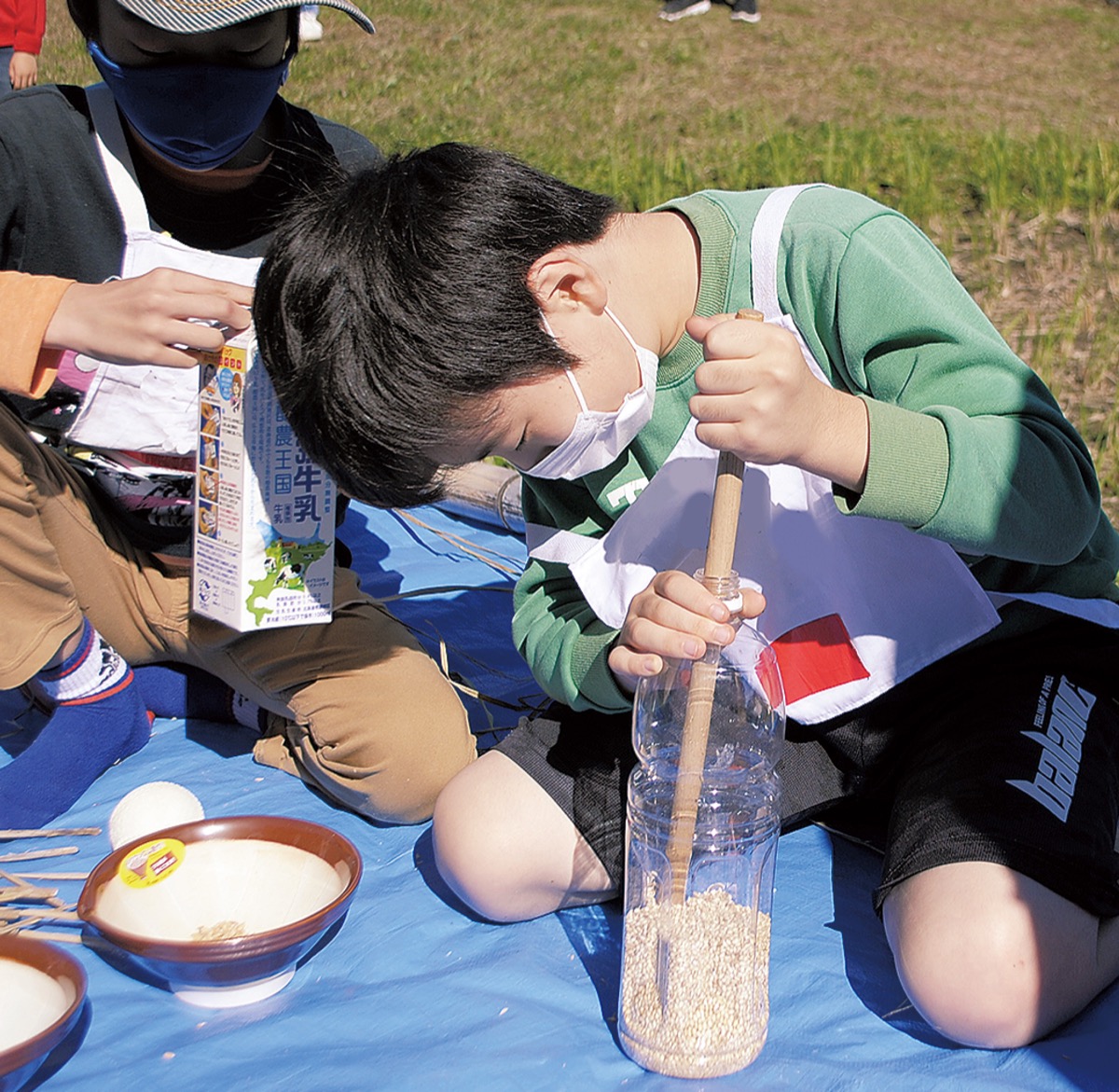 この日は10月上旬に刈り取ったもち米「まんげつもち」を脱穀し、すり鉢と野球ボールで籾すりの工程を経て手にした玄米をペットボトルに入れ棒で突く、昔ながらの精米作業を体験。リズミカルに棒を突き、糠が取れた白い米が現れると子どもたちは「やったー」などと声をあげていた。
