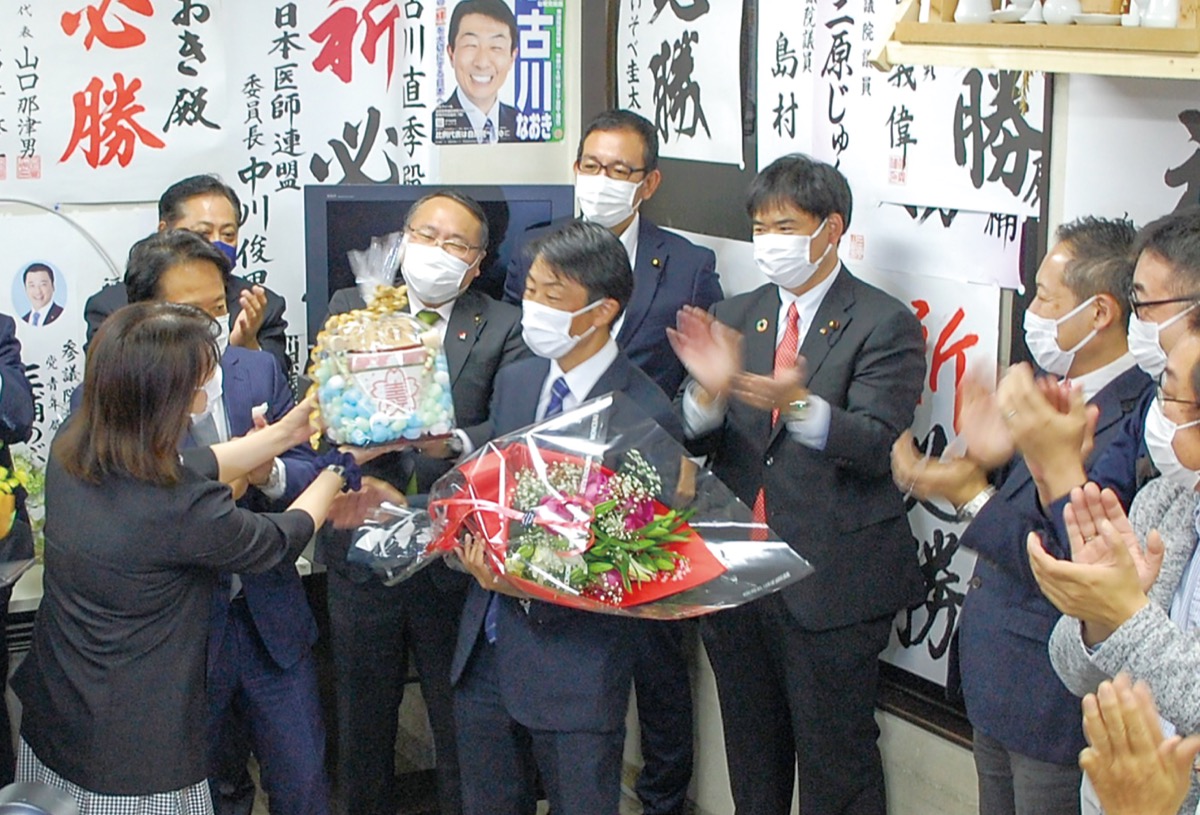 多くの支援者が駆け付けた古川事務所。日付が変わった1日0時30分ごろ、テレビの開票速報で「当確」が出ると事務所内は大きな歓声と拍手に包まれた。支援者の前に姿を現した古川氏は「学生ボランティアや支援者の皆様のご支援に、改めて感謝申し上げます。これまでの市会議員の経験を国政に生かしていきたい」と喜びの言葉を口にした。