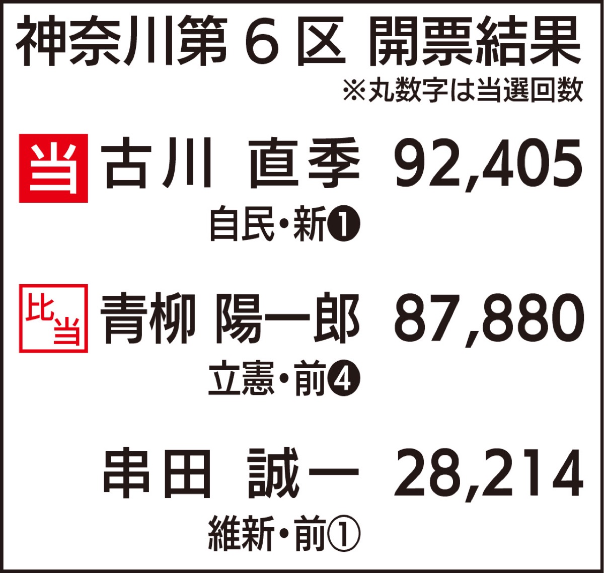 「第49回衆議院議員総選挙」が10月31日投開票され、神奈川6区(保土ケ谷区・旭区)では自民党の新人・古川直季氏(53)が9万2405票を獲得し、立憲民主党の前職・青柳陽一郎氏(52)を下し、初当選を果たした。青柳氏は比例で復活当選、2017年秋の前回選挙で比例区で当選していた日本維新の会の前職・串田誠一氏(63)は議席獲得に至らなかった。