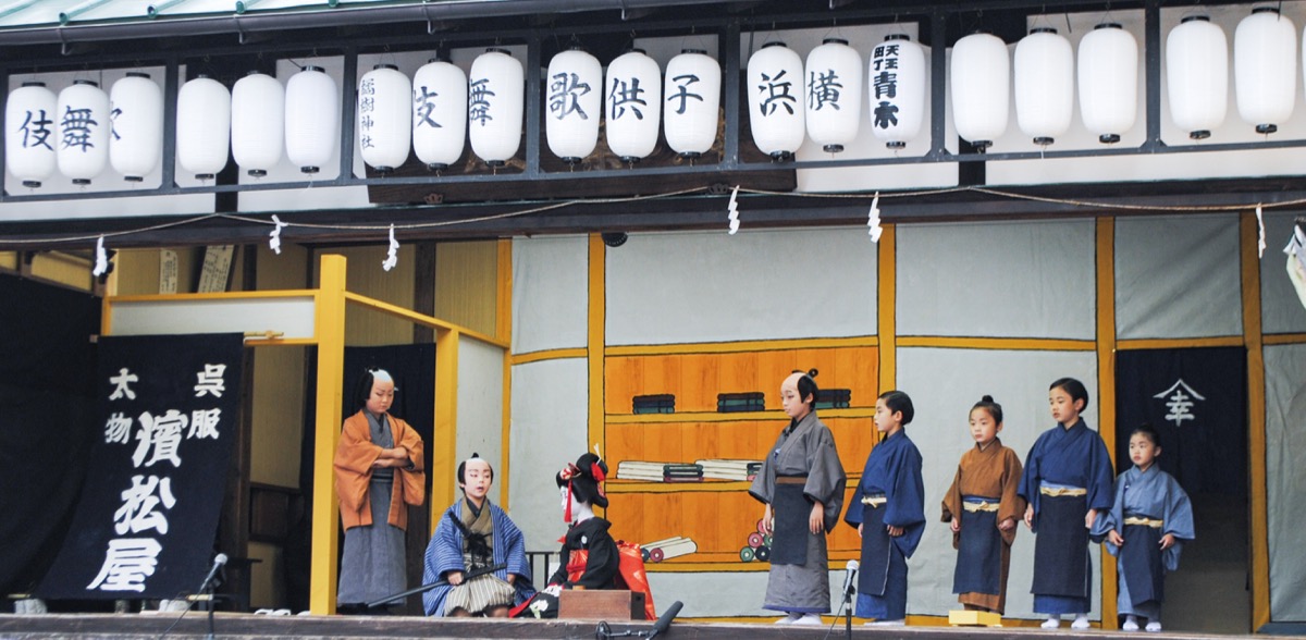 天王町の橘樹神社内にある神楽殿で11月21日、地域に暮らす幼稚園児や小学生12人が出演し、奉納歌舞伎公演が行われた。