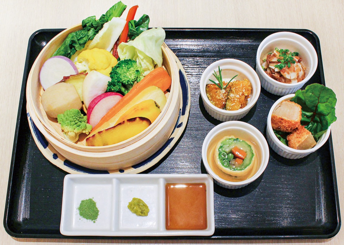 1日から提供されている「農家レストランのカラフル温野菜」は西谷で江戸時代からつづく農家の13代目で、年間およそ100品目の露地野菜と果樹を栽培する苅部農園の代表・苅部博之さんと椿シェフが開発。「横浜野菜」のせいろ蒸しをメインに「まんじろうカボチャのロースト」や「菊芋の梅肉和え」など珍しい野菜を使った4つの小鉢がセットになっている。