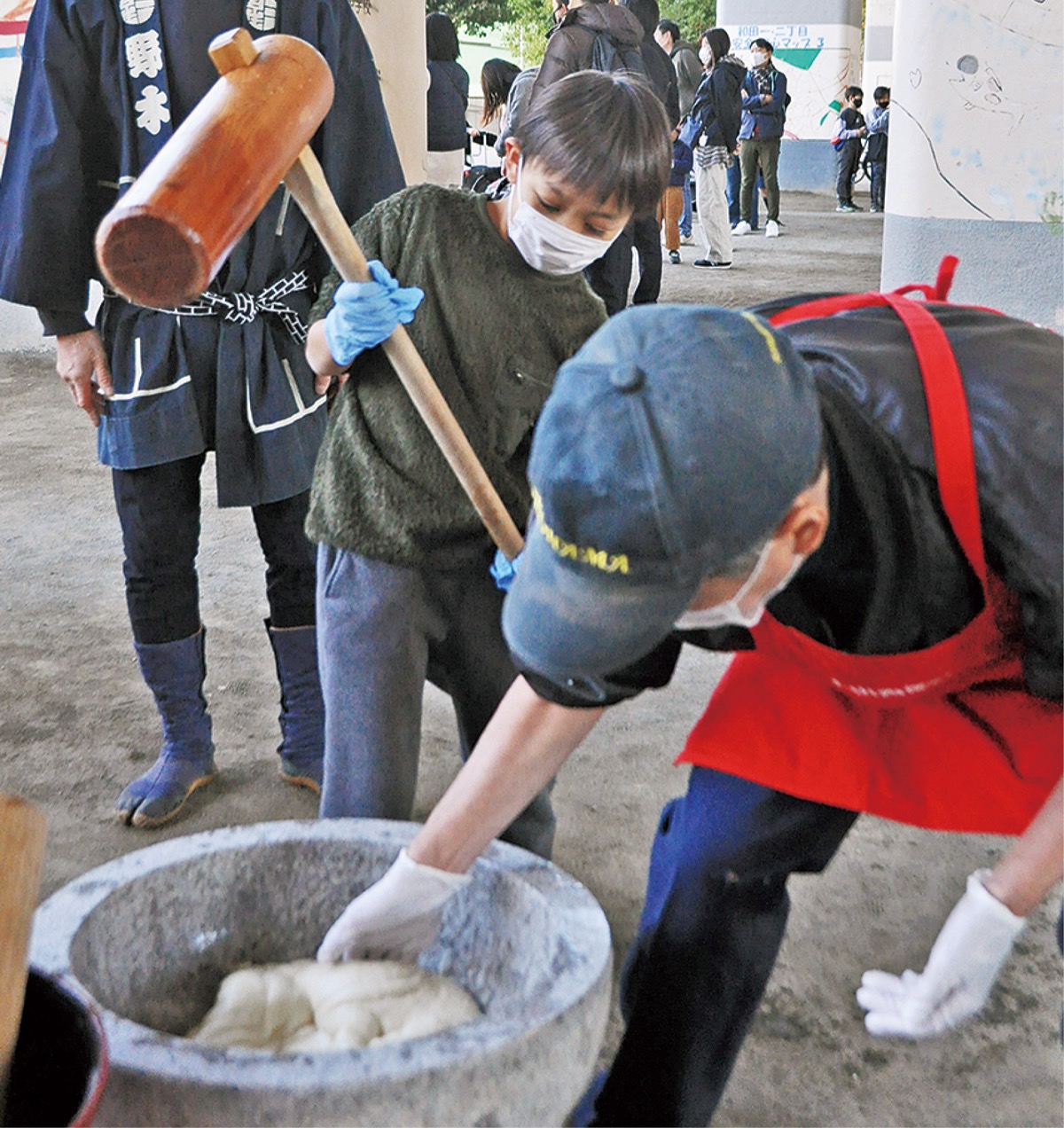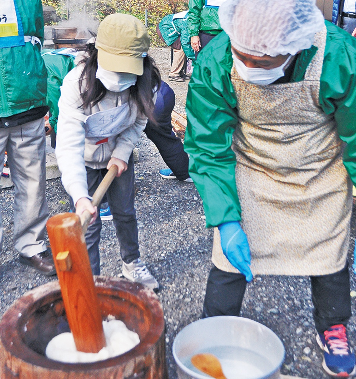 和田西部町内会(宇佐美勝彦会長)でも5日、恒例の餅つき大会を開催=写真右。1989年に始まった取り組みで地域に師走の訪れを告げる行事として定着している。この日は地域住民らが一斗張りの石臼で餅つきを体験。親子連れらが「よいしょ」という掛け声に合わせ杵を振り、つきたてのきなこ餅やあんこ餅などを販売。約12万8千円の売上金は区社会福祉協議会に寄付するという。