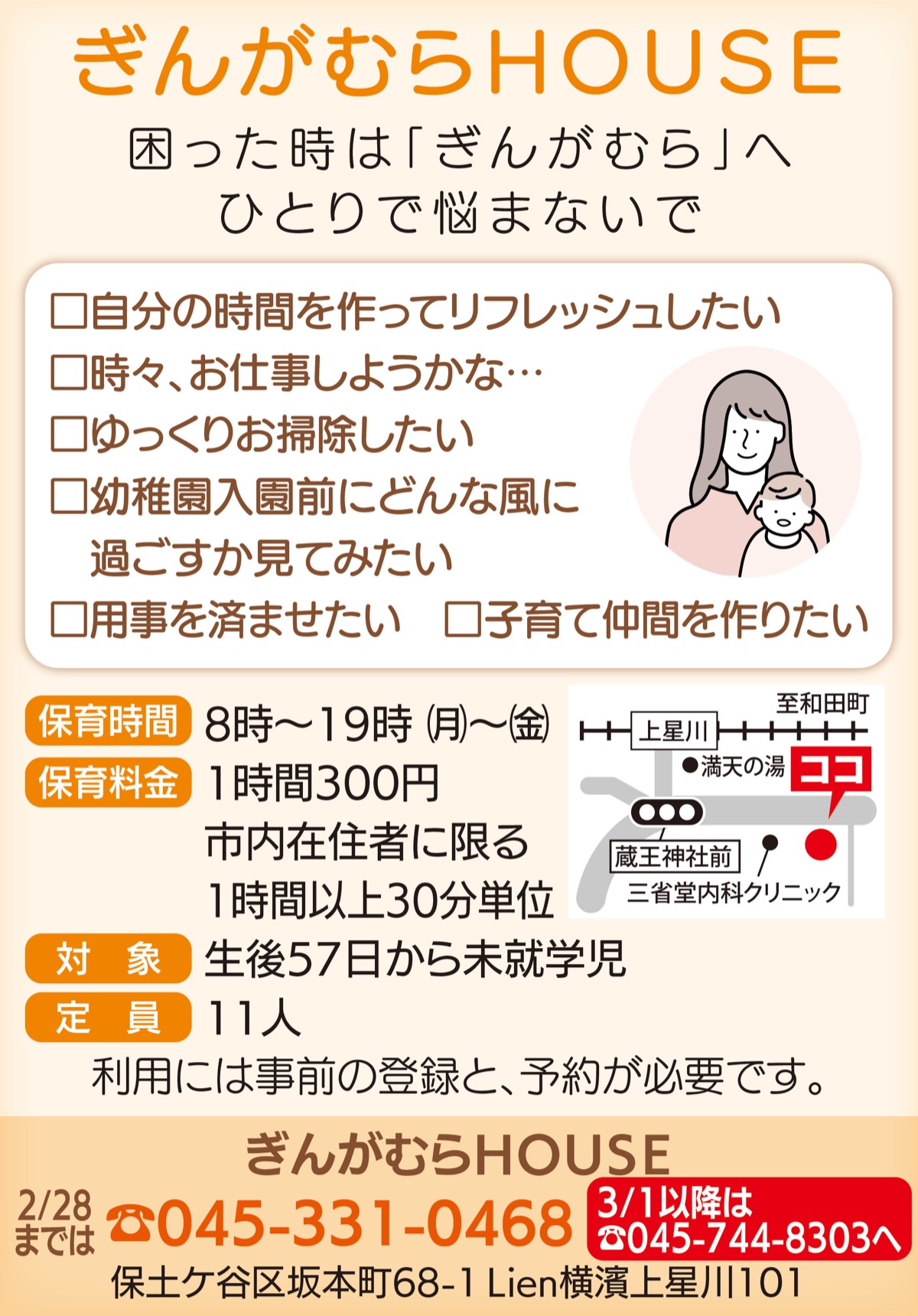 峰岡町で「親と子のつどいの広場」を運営するNPO法人ぎんがむらが、保土ケ谷区内では初となる横浜市乳幼児一時預かり事業として坂本町に「ぎんがむらHOUSE」を開設する。