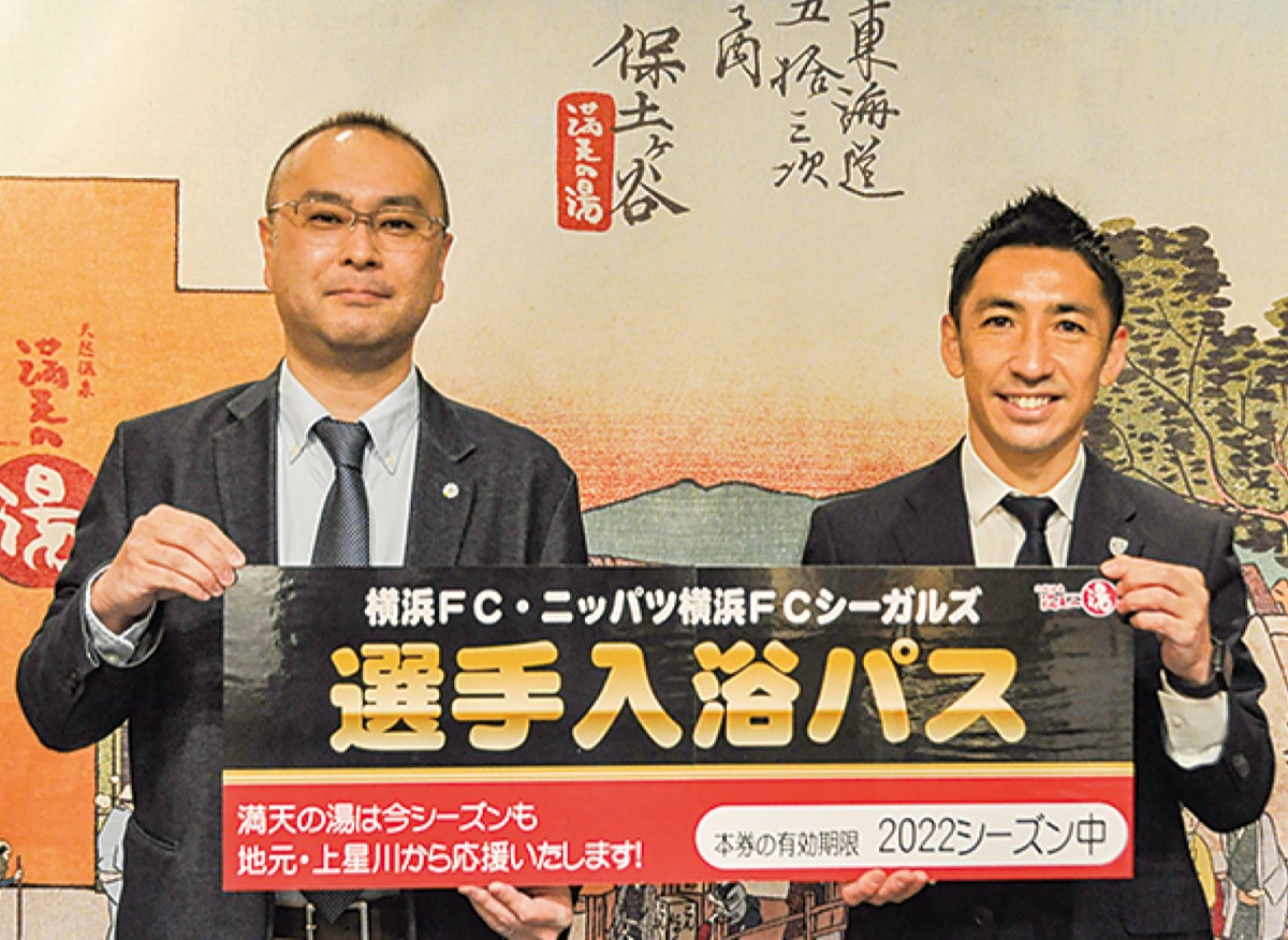 相鉄線上星川駅前にある温浴施設「満天の湯」で2月10日、川島町に拠点を構えるサッカーJ1・横浜FCとニッパツ横浜FCシーガルズの選手・スタッフへの入浴パス交付式が行われた。