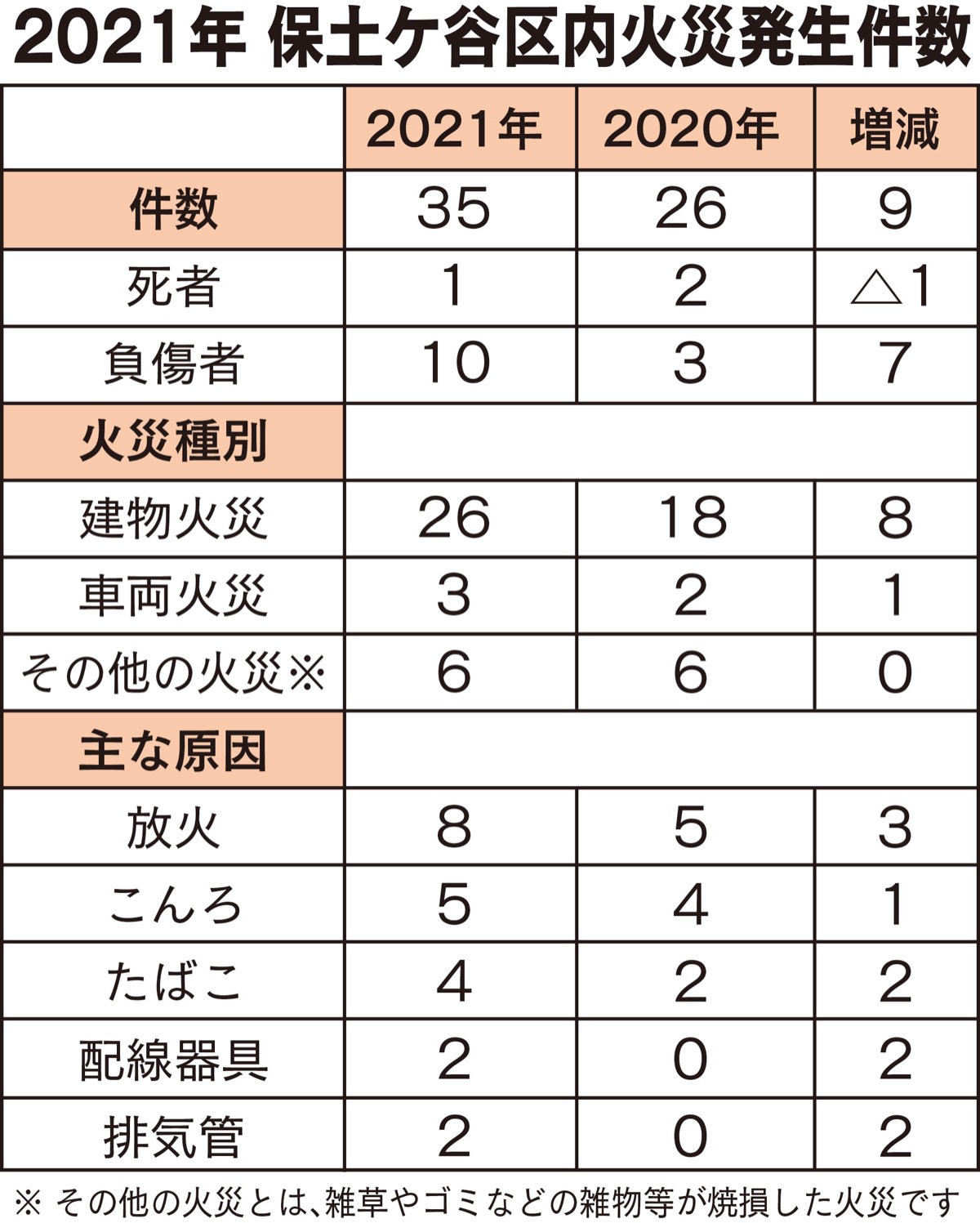 保土ケ谷区内で昨年1年間に発生した、火災状況の速報値がこのほどまとまった。保土ケ谷消防署によると、年間の火災件数は35件で、前年に比べ9件増加。主な火災種別としては建物火災が一番多かった。