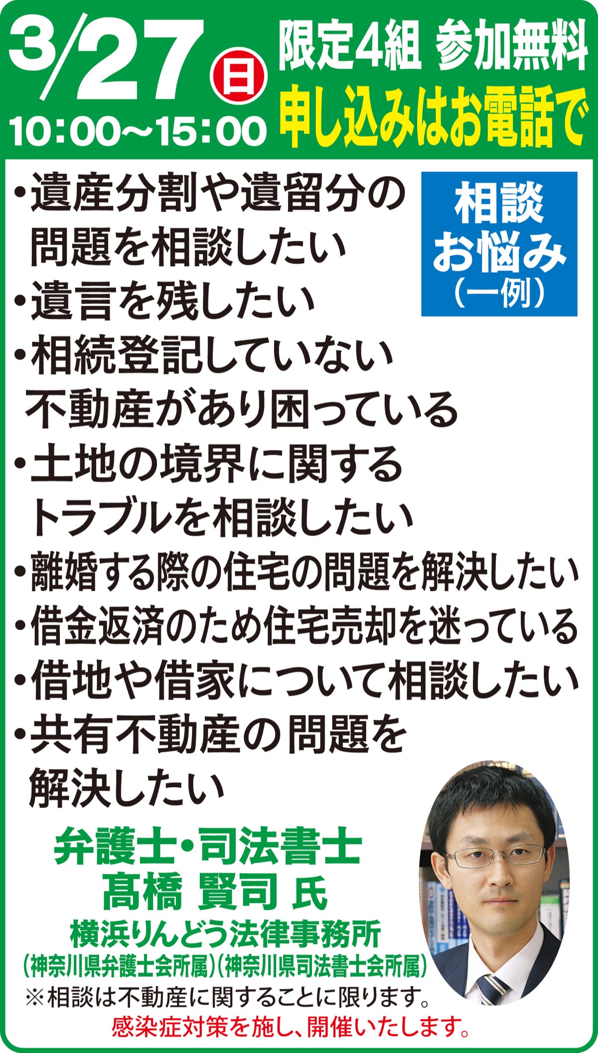 相鉄不動産販売・横浜店では、弁護士による相続・不動産の無料個別相談会を3月27日(日)に行う。相談を受けるのは弁護士・司法書士の高橋賢司氏。相続や債務整理、離婚時の財産分与などを中心に、不動産に関する多くの相談を受けており「今まで悩んでいた問題が解決できた」など参加者から好評だ。