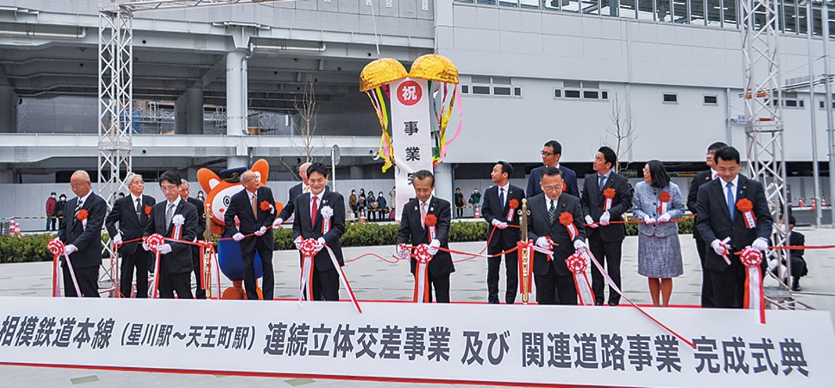 相鉄線星川駅─天王町駅間の連続立体交差事業と関連道路事業の完成式典が3月末に星川駅南側に整備が進められていた駅前広場で開かれ、山中竹春市長や相模鉄道の千原広司社長、地元住民ららおよそ60人が事業完了を祝った。