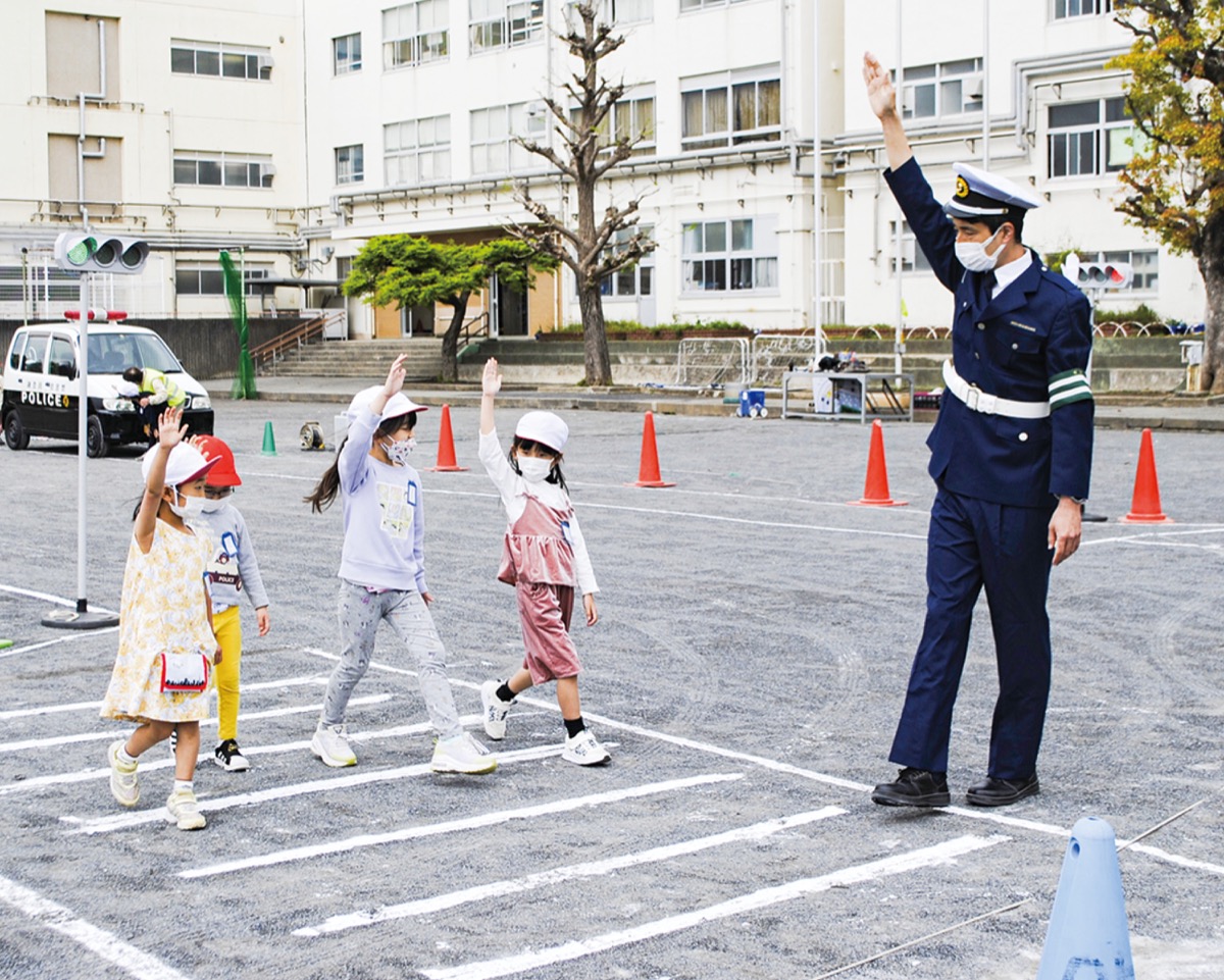 校庭に模擬道路が用意されたこの日の教室では、この春、入学した1年生およそ100人も参加。「歩道を歩くときは建物側を歩く」「青色の信号が点滅しているときは渡らない」「歩道も路側帯もない道路では、車を見ながら歩けるように道路の右側を歩く」など、安全に登下校するためのポイントを保土ケ谷警察署交通課の署員や保土ケ谷交通安全協会の指導員、交通安全母の会の会員らが指南した。